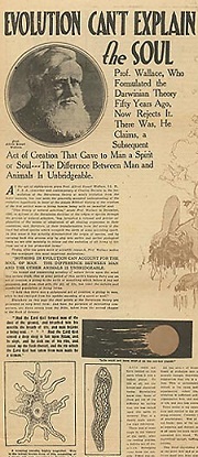 Por otra parte, Wallace se convirtió en espiritualista y al mismo tiempo, comenzó a mantener la idea de que la selección natural no podía considerar a los genios matemáticos, artísticos, o musicales, así como las reflexiones metafísicas, el ingenio o el humor. Finalmente, dijo que algo del «universo invisible del Espíritu» había interferido al menos tres veces en la historia. La primera sería la creación de vida a partir de materia inorgánica. La segunda, la inclusión de la conciencia en los animales superiores. Y la tercera sería la generación de facultades mentales superiores en el ser humano. También creía que la razón de ser del universo era el desarrollo del espíritu humano.